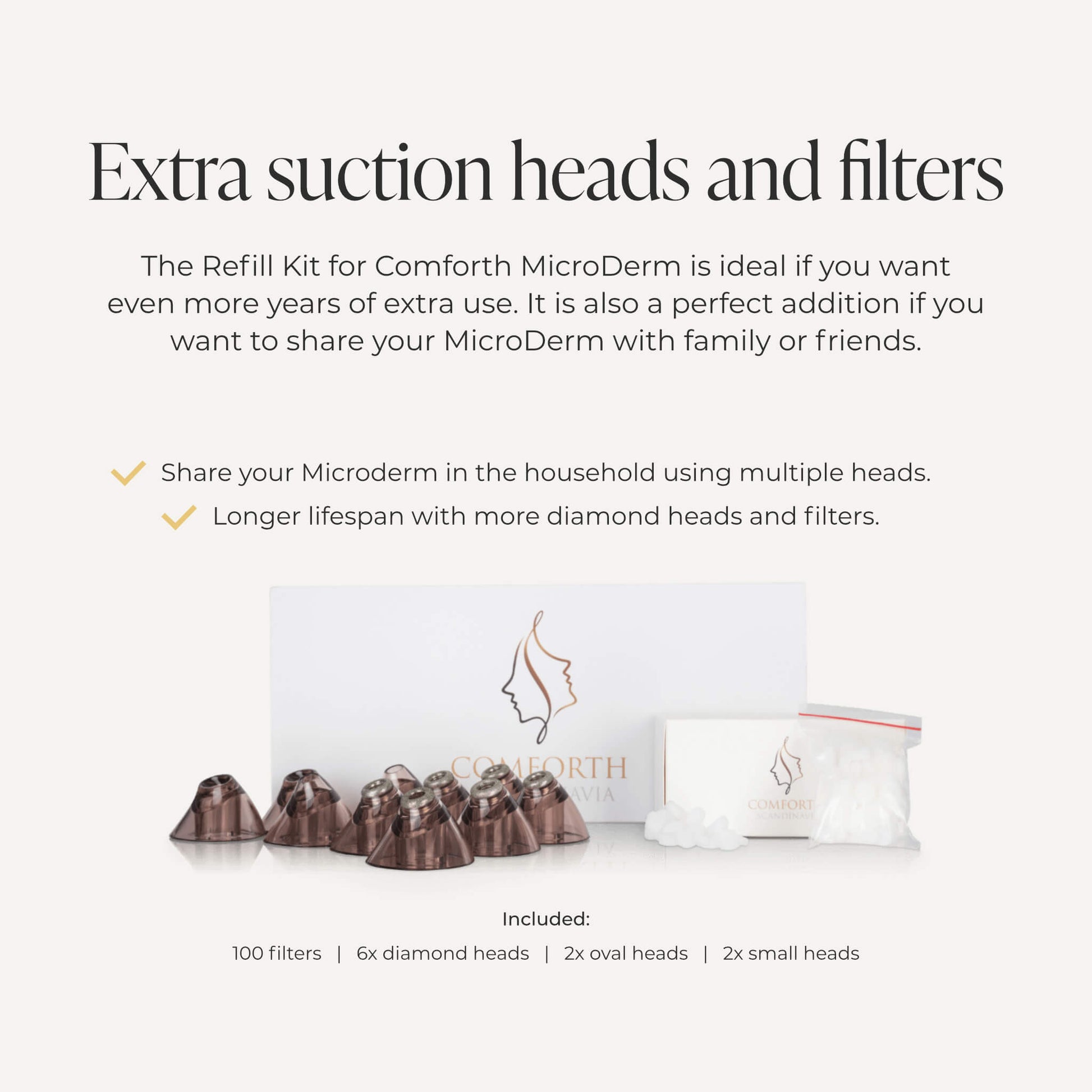 El kit de recarga Comforth es el complemento perfecto si desea compartir su MicroDerm con familiares o amigos, o si desea obtener años adicionales de uso.